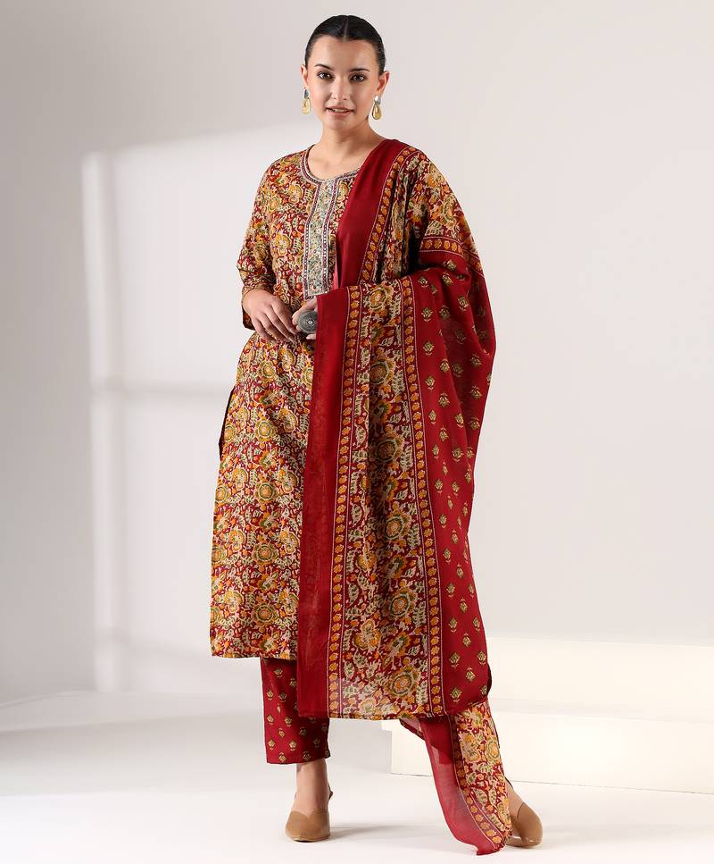 If you find the product for less we'll match it! Know MoreEmbrace the deep, soulful tones of our Manjari Suit Set, a 3-piece ensemble that celebrates traditional Indian artistry. The kurta is drenched in a rich maroon wine base, featuring an all-over Ajrakh-inspired intricate floral and paisley print in earthy mustard and sage hues. The design is highlighted by a structured rectangular neck placket adorned with delicate Chikankari-style embroidery and silver gota-patti accents. Paired with coordinating small butti-print trousers and a matching maroon dupatta, this set is a masterpiece of ethnic elegance.