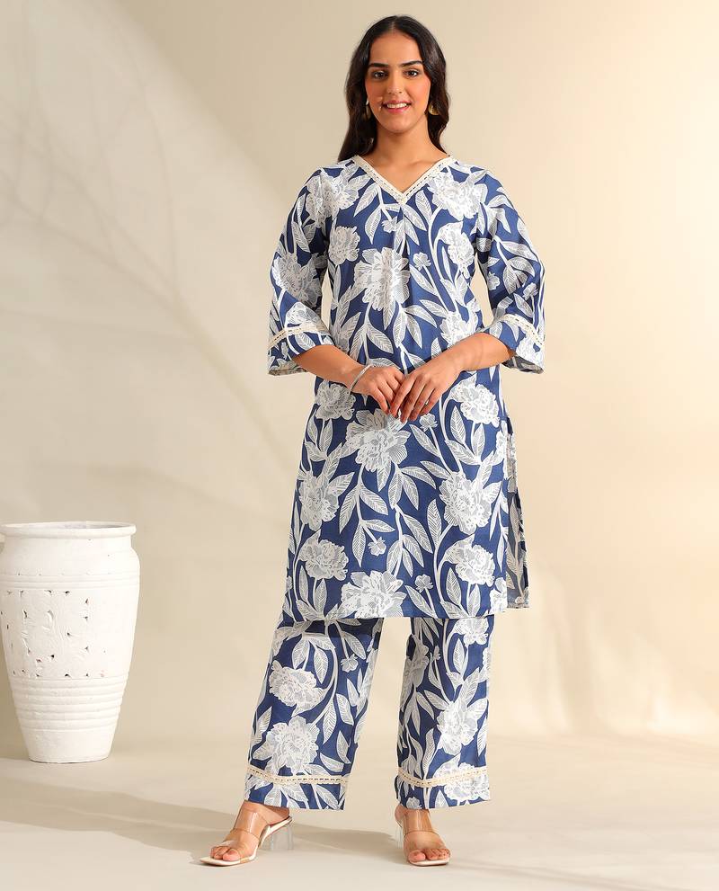 If you find the product for less we'll match it! Know MoreInfuse your wardrobe with timeless appeal with the Meera Set, featuring a high-contrast indigo botanical silhouette print USP. This sophisticated ensemble is rendered in a deep indigo blue hue, decorated with large, artistic white floral and leaf motifs that flow across the straight-cut kurta. The look is elegantly framed by a crisp white lace-trimmed V-neckline and features center pleat detailing for a relaxed, graceful drape. It is paired with coordinating wide-leg printed trousers, finished with matching lace borders for a cohesive and polished ethnic look.