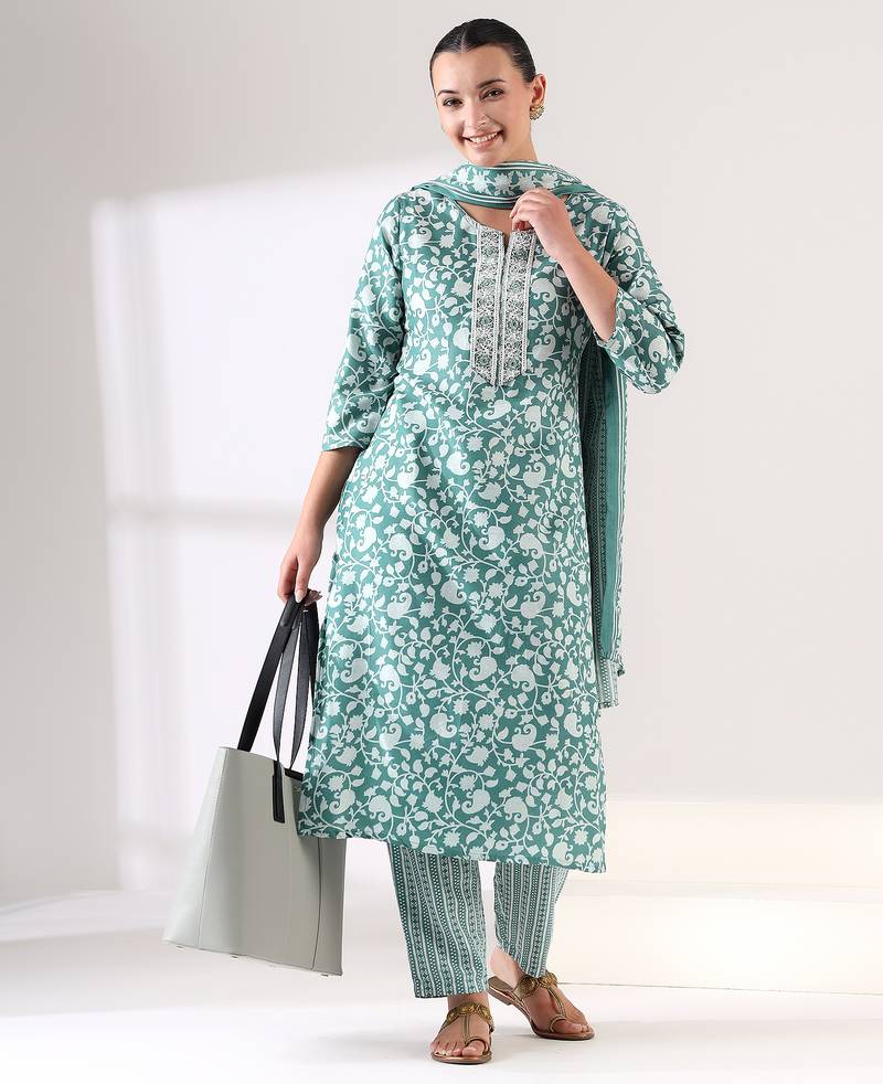 If you find the product for less we'll match it! Know MoreExude timeless charm with the Meera Suit Set, a refreshing teal-green 3-piece ensemble designed for both comfort and elegance. This set features a straight-cut kurta adorned with an all-over white paisley and floral vine print. The rounded neckline is enhanced by a vertical white thread-work and mirror-work embroidered placket, lending a sophisticated artisanal touch. Completed with coordinated striped trousers and a matching printed dupatta, this ensemble is an ideal staple for casual elegance or daytime festivities.
