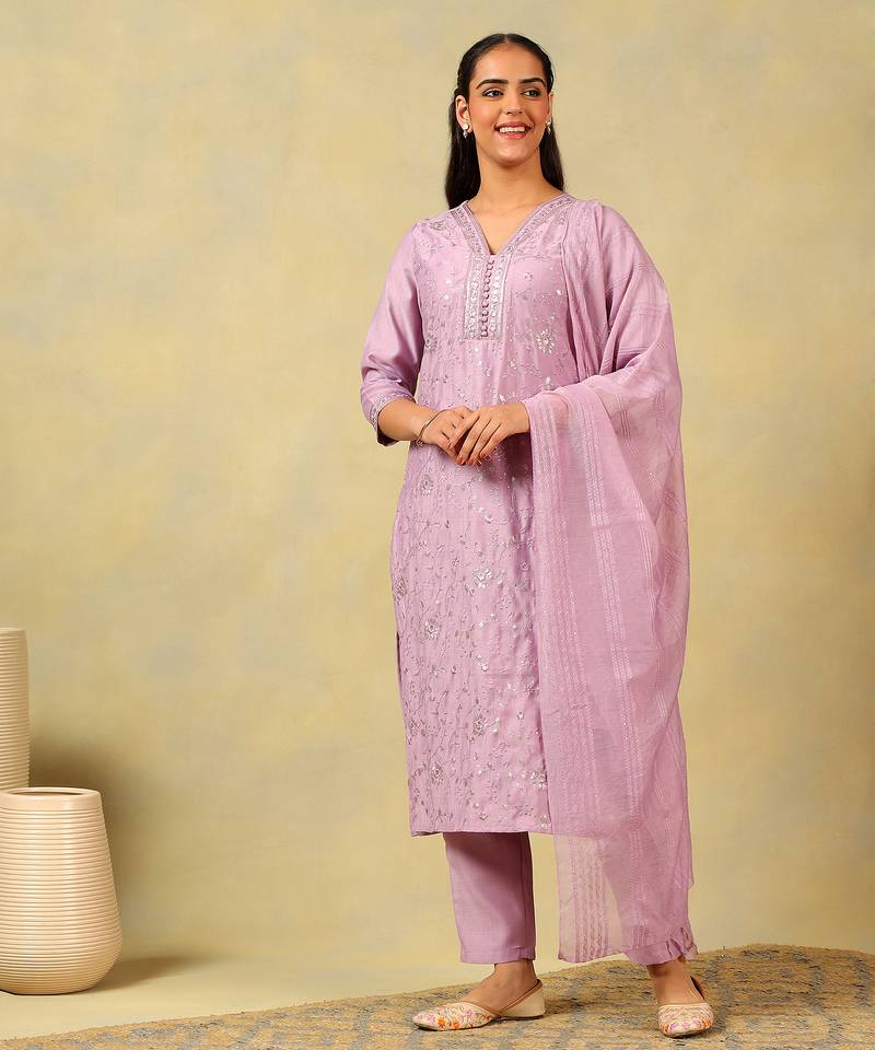 If you find the product for less we'll match it! Know MoreGrace any occasion with the Meher Set, featuring a romantic lavender floral embroidery and sequin USP. This exquisite suit set is rendered in a soft lavender-lilac hue and is adorned with delicate all-over tone-on-tone floral embroidery interspersed with shimmering silver sequins. The kurta is thoughtfully designed with a refined V-neckline featuring central fabric-covered buttons and an intricate embroidered border. Paired with solid lavender trousers and a matching lightweight dupatta with subtle silver striped detailing, this ensemble offers a sophisticated and luminous silhouette for evening celebrations.