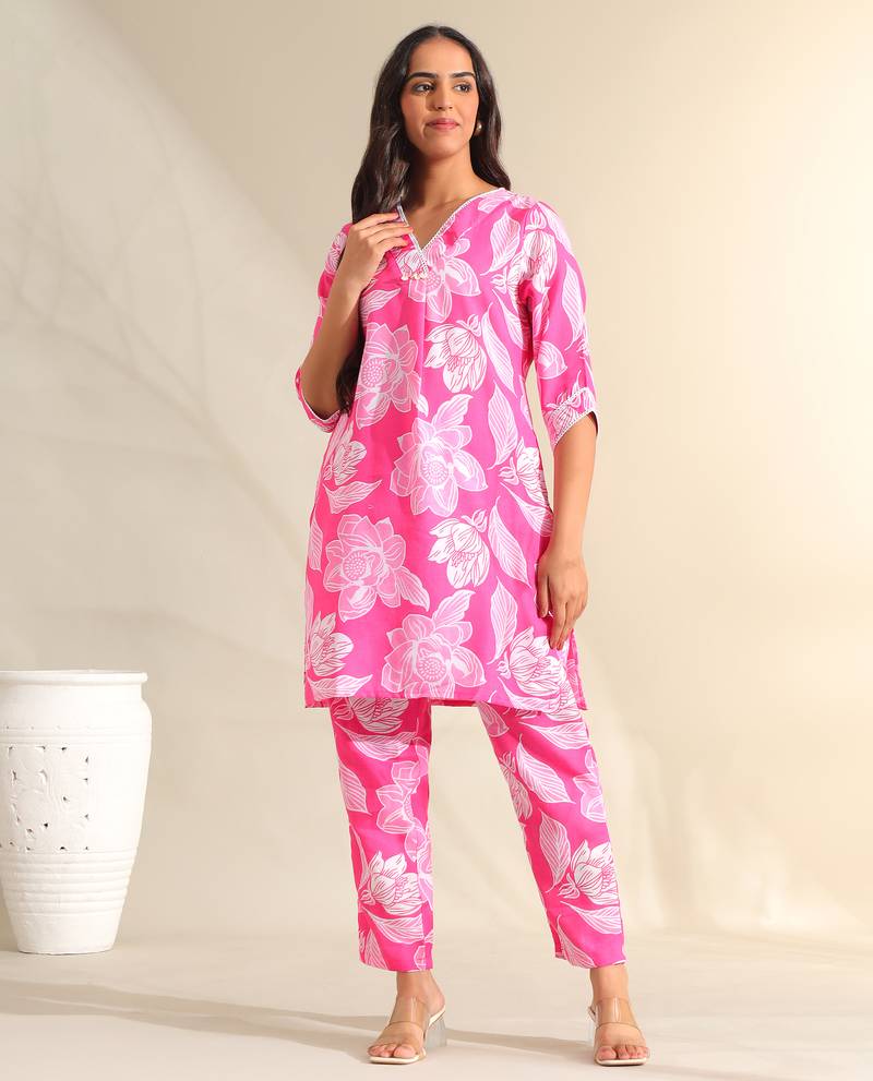 If you find the product for less we'll match it! Know MoreInfuse your collection with a burst of color with the Mishti Set, featuring a radiant magenta and white botanical outline USP. This contemporary coordinated ensemble is rendered in a vivid pink hue and is decorated with large-scale white floral silhouettes and leaf outlines that create a high-contrast, energetic look. The top is designed with a refined white lace-trimmed V-neckline featuring a central pleat and pearl-style button accents, offering a feminine and polished silhouette. Paired with matching printed trousers, this set provides a cohesive, fashion-forward ethnic look that is perfect for summer festivities.