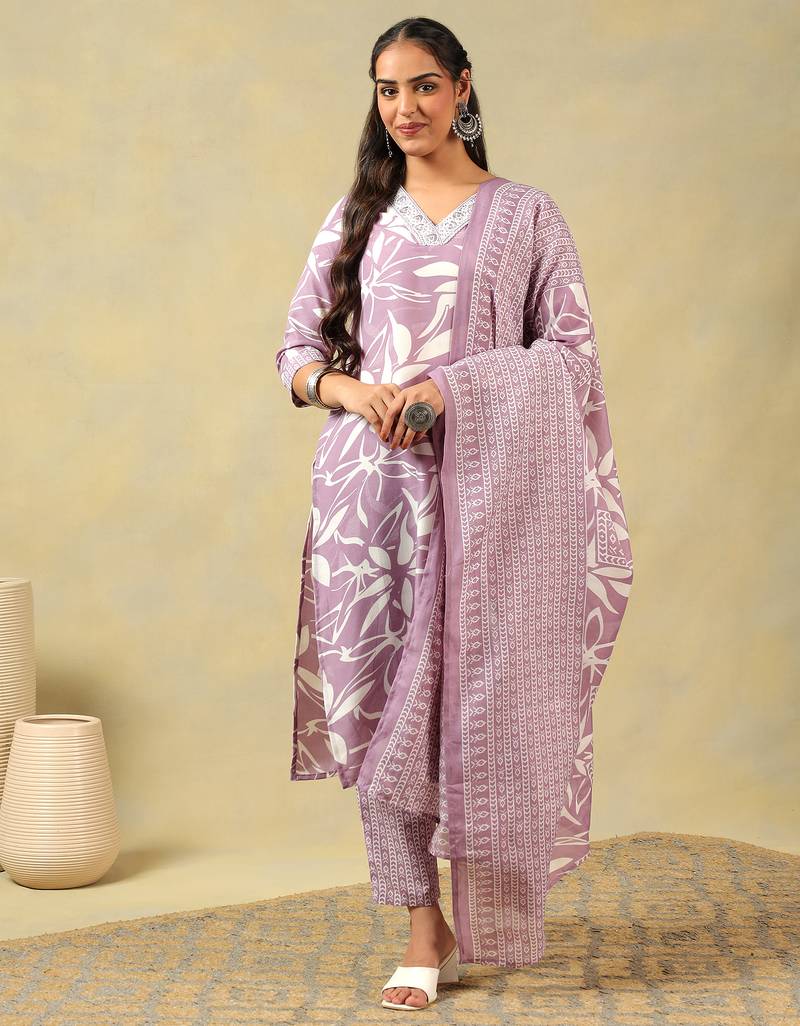 If you find the product for less we'll match it! Know MoreExude a sense of calm and modern grace with the Myra Set, featuring a striking lavender leaf silhouette print USP. This contemporary ensemble is rendered in a soft lavender-purple hue and decorated with large, artistic white leaf motifs that flow across the straight-cut kurta. The design is elegantly framed by a silver-accented V-neckline border with delicate embroidery, paired with coordinating micro-patterned trousers and a matching leaf-print dupatta with structured borders for a sophisticated tonal look.