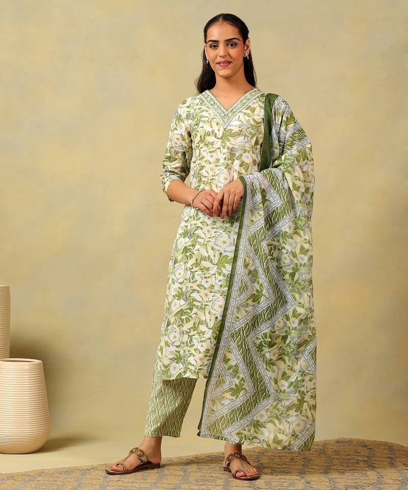 If you find the product for less we'll match it! Know MoreBring the serenity of nature to your festive wardrobe with the Navya Set, featuring a refreshing olive foliage botanical print USP. This ensemble showcases an all-over layered print of delicate leaves and flowers in shades of sage, forest green, and ivory. The design is beautifully framed by a V-neckline with a coordinated leaf-pattern border, paired with matching micro-print trousers and a stunning dupatta featuring a layered chevron and floral border for a sophisticated, natural ethnic look.