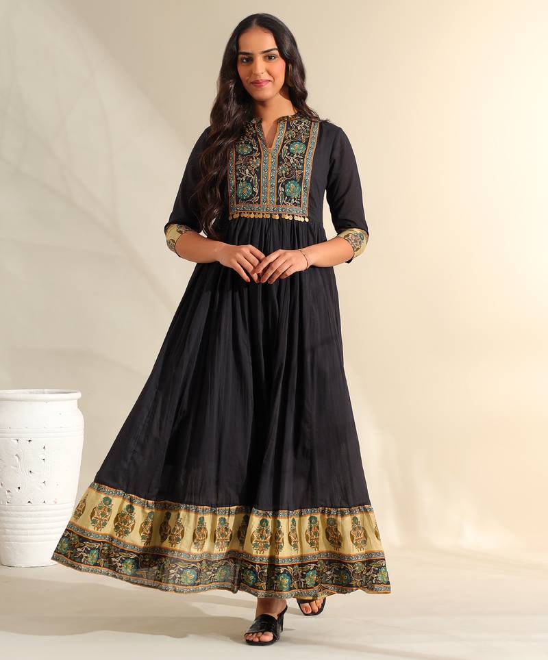 If you find the product for less we'll match it! Know MoreCaptivate the room with the Nayantara Dress, featuring a luxurious midnight gold coin fringe USP. This floor-length gown is crafted in a deep charcoal black fabric that drapes beautifully into a voluminous, gathered flare. The highlight of this piece is the intricate floral embroidered yoke in shades of teal and gold, finished with a unique row of metallic gold coins that add movement and a touch of bohemian glam. The hemline and cuffs are adorned with a wide, contrasting beige border featuring traditional botanical motifs, making it an exquisite choice for evening celebrations.