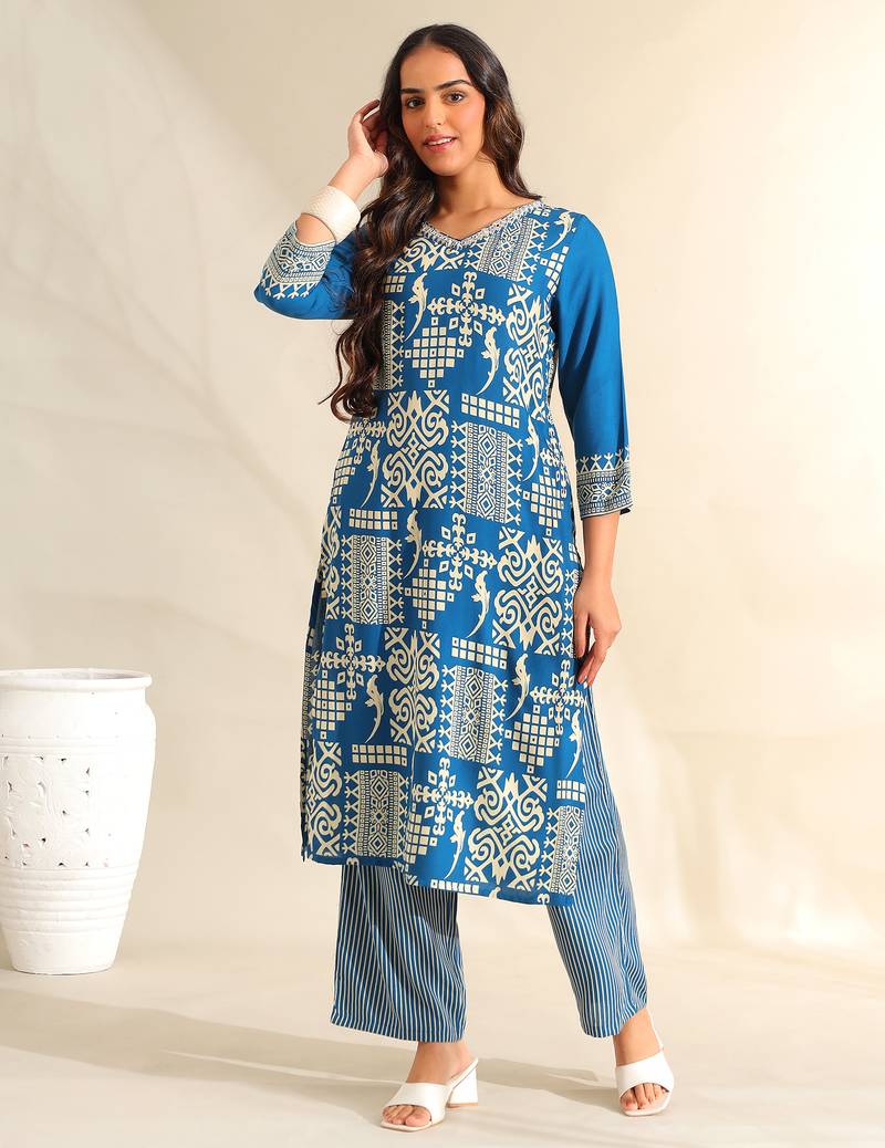 If you find the product for less we'll match it! Know MoreElevate your daily wear with the Noor Set, featuring a sophisticated azure tribal geometric block print USP. This elegant ensemble is rendered in a deep cerulean blue and adorned with an intricate arrangement of ivory geometric tiles and abstract ethnic motifs. The kurta is designed with a delicate white embroidered V-neckline that provides a refined contrast to the bold pattern. It is paired with coordinating wide-leg trousers in a vertical pinstripe pattern, creating a sleek and balanced silhouette for a modern ethnic look.
