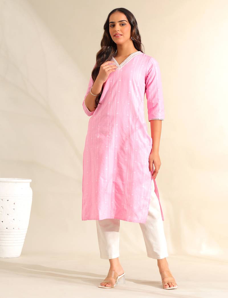 If you find the product for less we'll match it! Know MoreExude a soft, feminine grace with the Pari Kurta-Set, featuring a delicate rose zari stripe USP. This vibrant pink kurta is designed with vertical self-textured stripes that incorporate subtle white patterns to elongate the straight-cut silhouette. The design is elegantly finished with a crisp white embroidered V-neckline border and matching lace trim on the sleeves, paired with solid white trousers for a fresh and clean minimalist ethnic look.