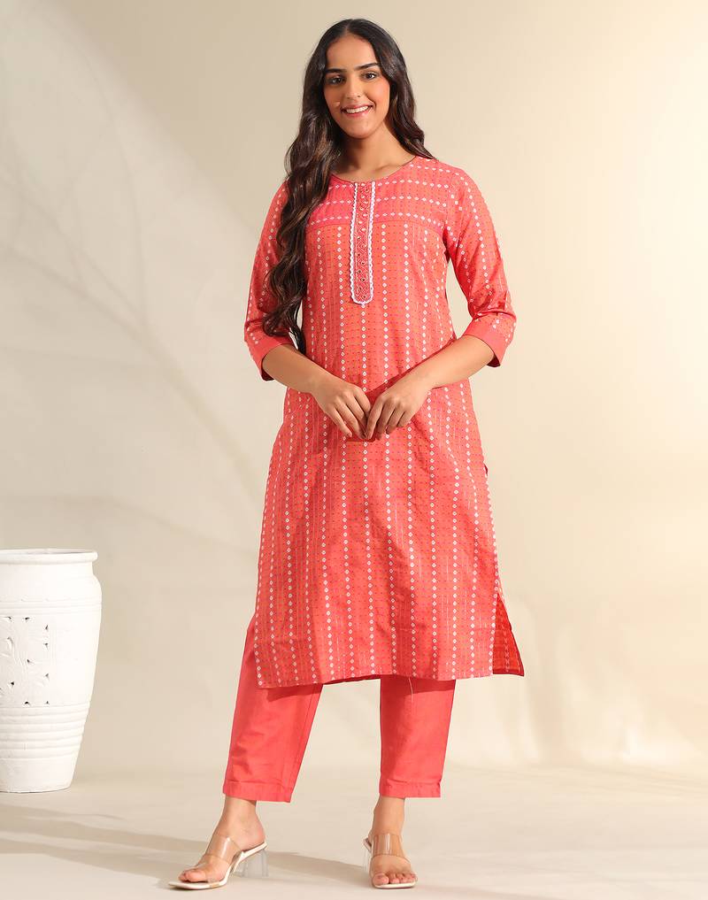 If you find the product for less we'll match it! Know MoreInfuse your wardrobe with warmth with the Prisha Set, featuring a sophisticated coral-peach bandhani-inspired print and mirror-work USP. This elegant suit set is rendered in a vibrant coral-peach hue and is adorned with a delicate all-over pattern of white geometric micro-dots arranged in vertical stripes. The kurta is beautifully detailed with a central lace-bordered placket featuring intricate embroidery and shimmering mirror-work accents, creating a refined and structured aesthetic. The look is completed with coordinating solid coral trousers, offering a clean and breezy silhouette perfect for both professional settings and festive daytime outings.
