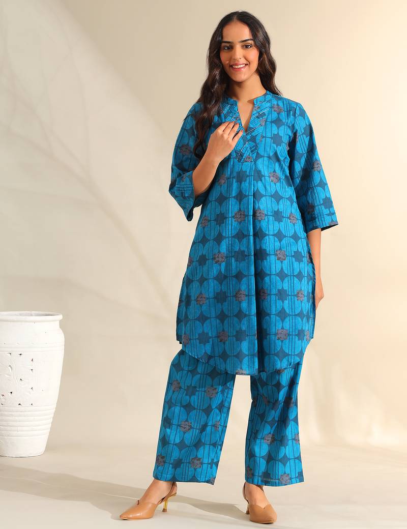 If you find the product for less we'll match it! Know MoreInfuse your modern ethnic wardrobe with the Reet Set, featuring a contemporary peacock geometric circle print USP. This striking teal-blue ensemble is patterned with deep navy circular motifs and abstract floral accents that create a structured, rhythmic design. The kurta is designed with a notched V-neckline featuring metallic beadwork, paired with a curved high-low hem for a fluid, sophisticated silhouette. It is completed with matching wide-leg printed trousers, offering a bold and cohesive look for professional or social gatherings.
