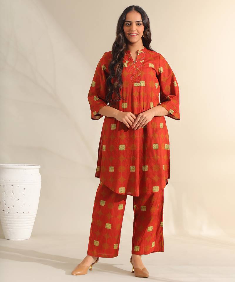 If you find the product for less we'll match it! Know MoreInfuse your ethnic collection with an earthy, contemporary vibe with the Reva Set, featuring a unique geometric tile print USP. This ensemble is rendered in a deep rust-red hue and accented with olive-green square motifs and subtle diamond patterns. The kurta features a structured V-neckline with a striped border panel, offering a clean and modern frame to the straight-cut silhouette. It is paired with coordinating wide-leg trousers in the same geometric print for a bold, cohesive, and fashion-forward look.