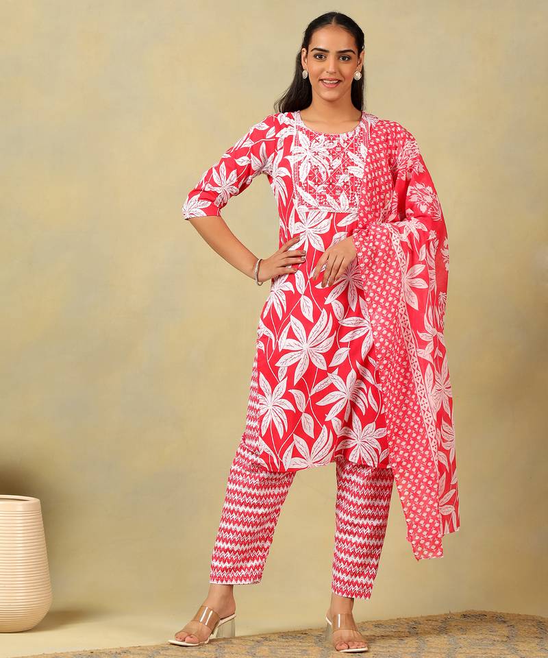 • Product Id : 4731009 • Package Details : 1 Kurta / 1 Pant / 1 Dupatta • Type : Kurta Sets • Region : India • Occasion : Casual • Fabric : Cotton • Work : Printed • Type : Floral Print • Look : Traditional • Sleeve : Quarter Sleeve • Neck Style : Round Neck • Color : Red • Stitching : Stitched • Length : 44.0 General - Color and Texture may have slight variation. This happens because of photography.