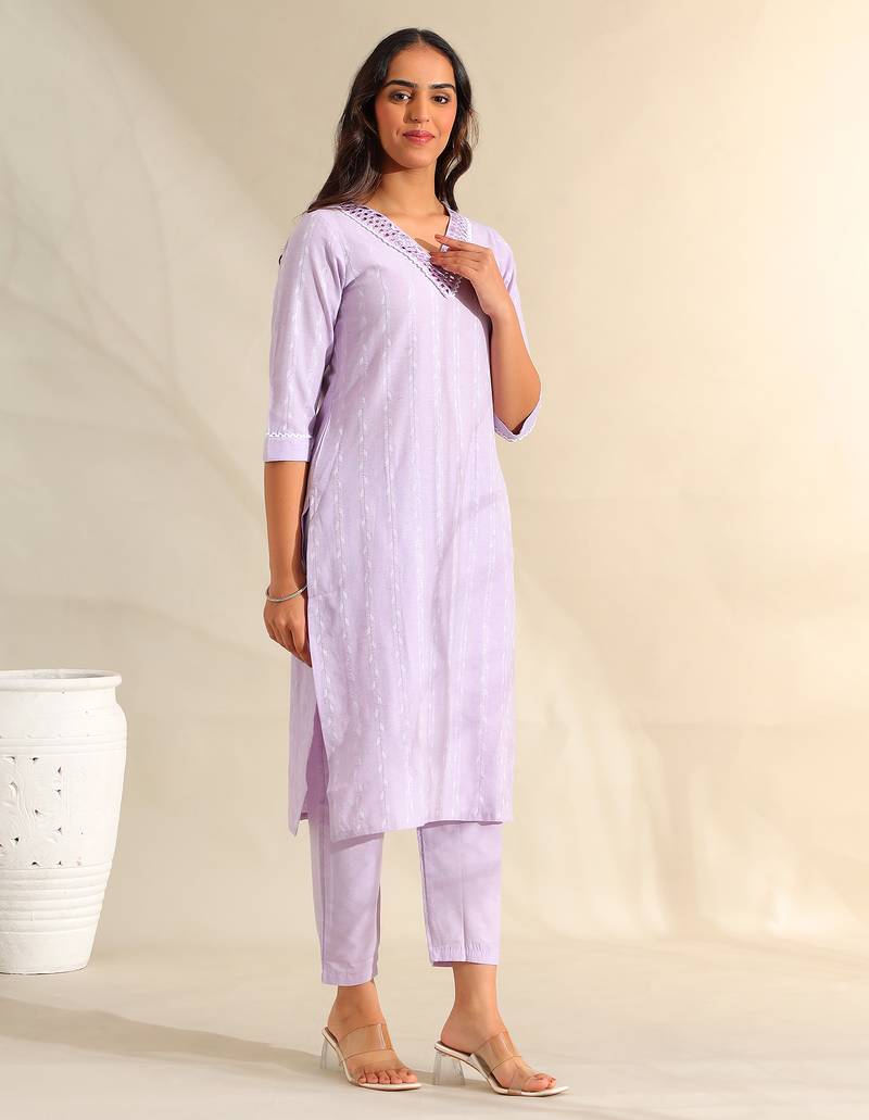 If you find the product for less we'll match it! Know MoreExude a soft, ethereal charm with the Sia Kurta-Set, featuring a delicate lavender zari stripe USP. This serene lavender kurta is designed with vertical self-textured stripes that incorporate a subtle shimmer to elongate the straight-cut silhouette. The design is beautifully highlighted by a shimmering V-neckline border with intricate mirror-style embroidery and gota-work, paired with coordinating solid lavender trousers and finished with dainty white lace edging on the sleeves for a refined, minimalist ethnic look.