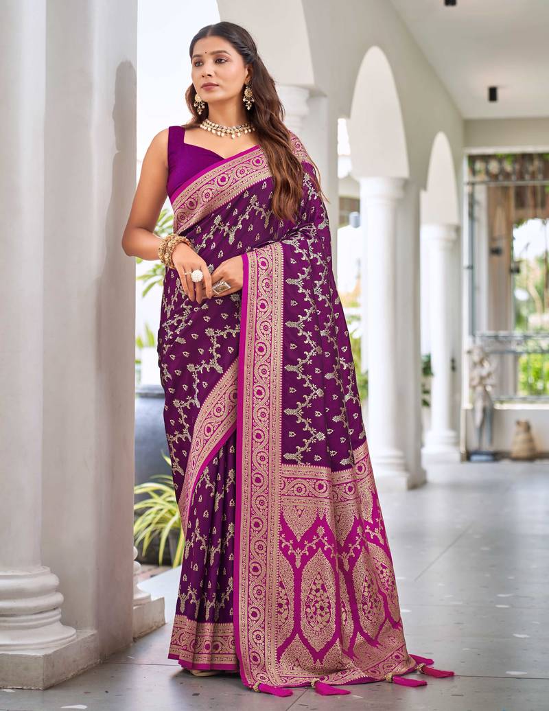 Banarasi Satin Silk Blend Woven Wine Purple & Dark Pink Saree With Heavy Jacquard Work Saree With Blouse Piece