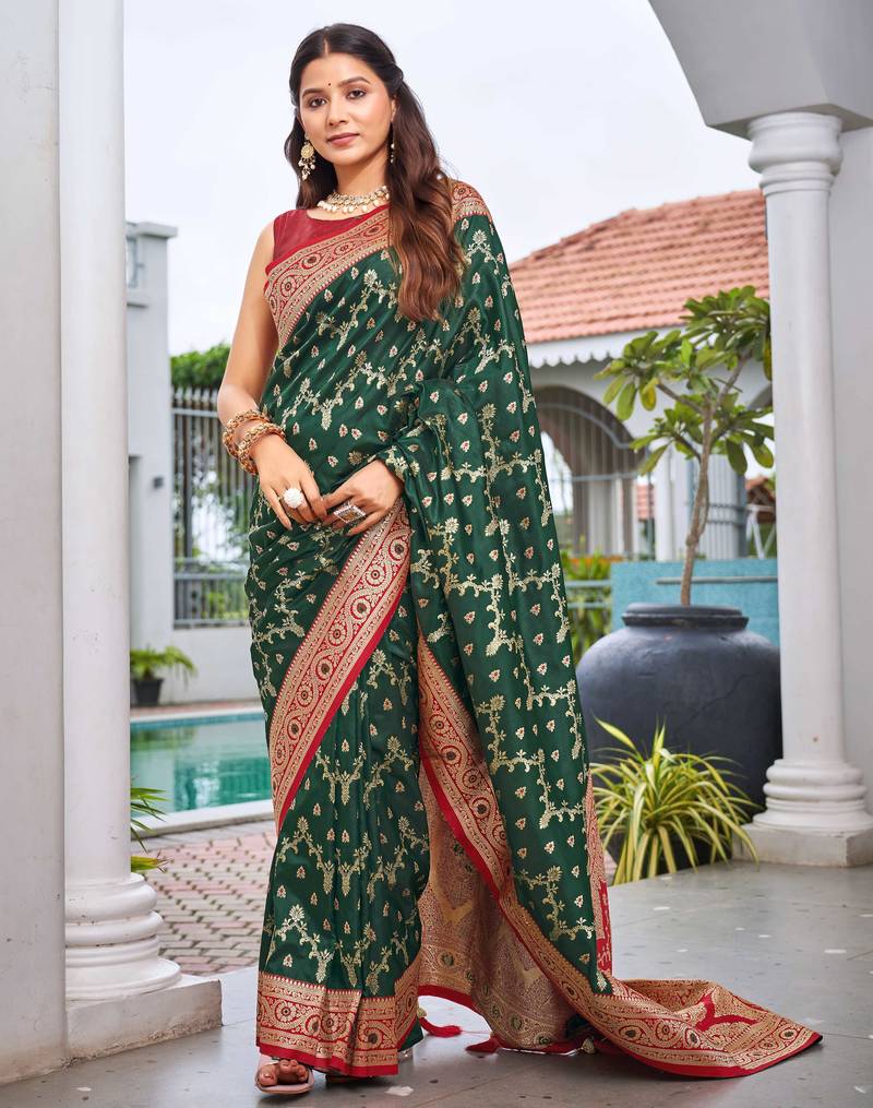 Banarasi Satin Silk Blend Woven Green & Red Saree With Heavy Jacquard Work Saree With Blouse Piece