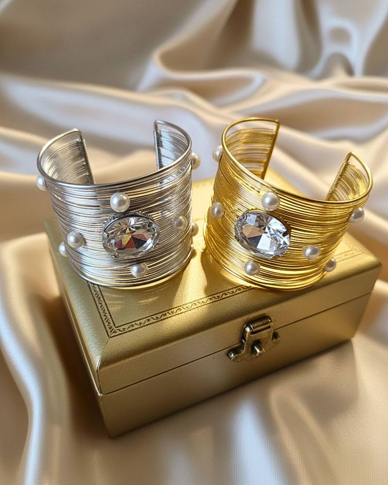 Combo Of Two Big Crystal Ad Pearl Stone Gold & Silver Plated Adjustable Cuff Bracelet
