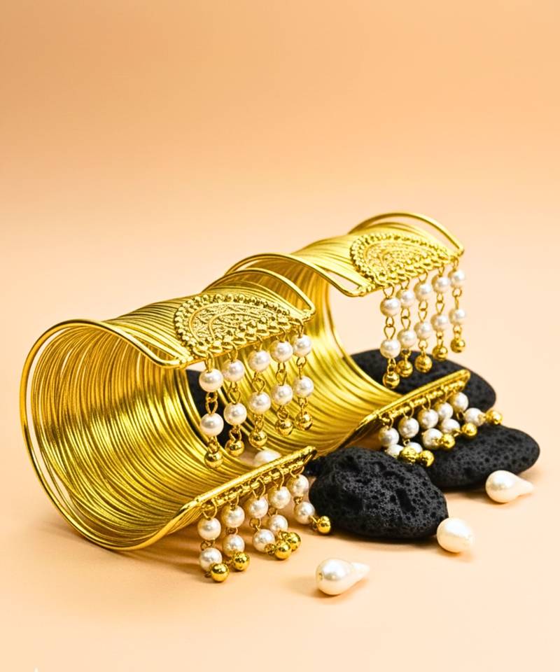 This is a Combo Of Two gold-plated bracelet showcases a stunning floral motif accentuated with intricate detailing and cascading Pearl ball hangings on both sides. Its elegant design blends traditional artistry with a modern touch, making it a perfect statement piece for festive occasions or special events.