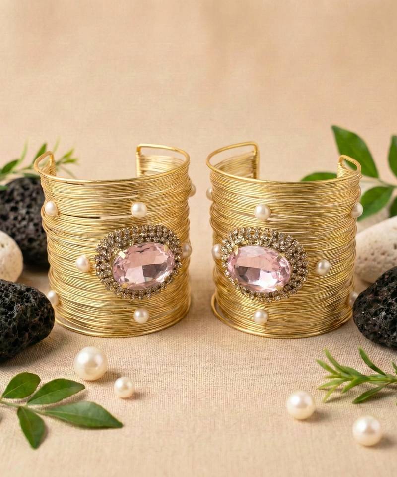 Combo Of Two Gold-plated mess wire cuff bracelet adorned with a AAA Grade Pearls placed in pattern all over the bracelet dazzling Big Pink Korean CZ shiny glass crystal stone.Its a Lightweight, adjustable, and perfect for elevating both casual and festive looks. A timeless statement piece for every jewelry lover.