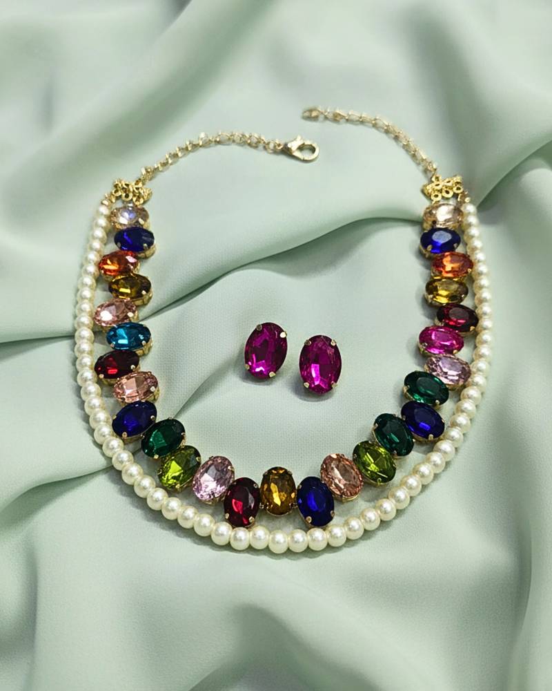 If you find the product for less we'll match it! Know MoreThe Necklace With Earrings is embellished with Combination Of AAA Grade Pearl Mala And multicolour glass CZ crystal stones and comes with an adjustable chain secured by a lobster claw clasp.