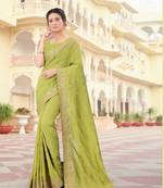 Drape this Green Indian Wedding two tone Vichitra Silk Saree, completed with heavy zari embroidery and stone work. It will carry Green unstitched Two tone vichitra Silk Blouse piece, which can be customized up to max 42 Indian standard size and its length 80 cms. (Slight variation in color is possible due to flash used during photo shoot. Blouse Shown in the Image is used for Photo Shoot, UnStitch Blouse Piece is attach with Saree.)