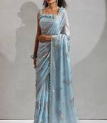 Sky Blue Foil Printed Two Tone Silk Blend Embroidered Saree