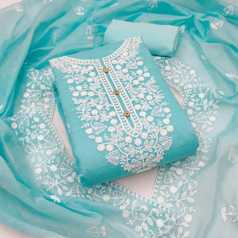 Women'S Sky Blue Unstitched Heavy Thread Embrodiery And Fancy Border With Embroidered Dupatta Chanderi Cotton Dress Material Having Sky Blue Color Bottom Of American Crape Fabric And Sky Blue Color Dupatta Of Chanderi Cotton Material With Awesome Sky Blue Colour In Chanderi Cotton Crape Fabric With Work Of Heavy Thread Embrodiery And Fancy Border With Embroidered Dupatta|| Images Are For The Referance Purpose Only, Color Of The Actual Product May Little Vary From The Image Due To Screen Resolution