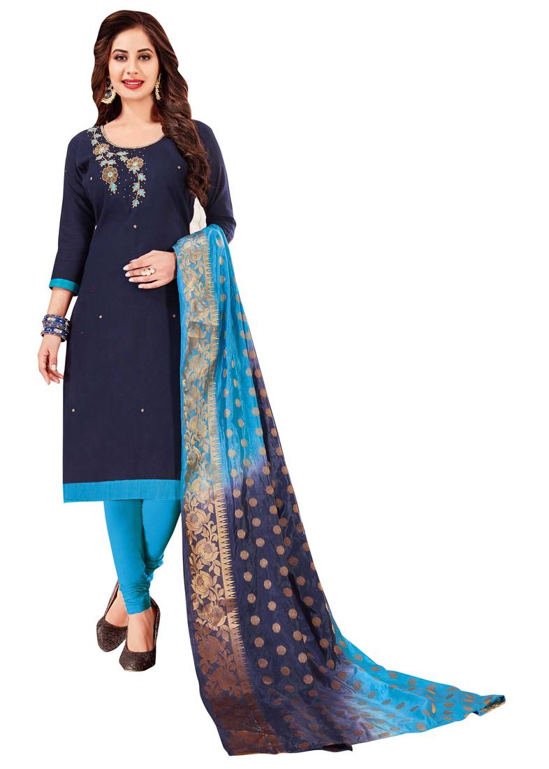 Blue Embroidered Cotton Salwar With Dupatta Semi stitched