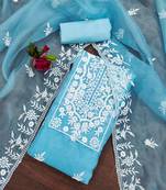 Women'S Sky Blue Unstitched Heavy Thread Embrodiery Organza Dress Material Having Sky Blue Color Unstitched Bottom Of Santoon Fabric And Sky Blue Color Dupatta Of Organza Material With Beautifull Sky Blue Colour In Organza Santoon Fabric With Work Of Heavy Thread Embrodiery With Stylish Neck And Border Work With Embroidered Dupatta Work|| Images Are For The Referance Purpose Only, Color Of The Actual Product May Little Vary From The Image Due To Screen Resolution