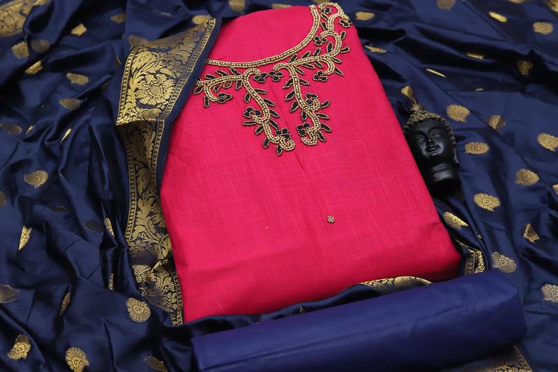 Women'S Pink Unstitched Designer Handwork Neck With Fancy Border And Weaving Dupatta South Slub Cotton Dress Material Having Blue Color Bottom Of Cotton Fabric And Blue Color Dupatta Of Banarasi Silk Material With Awesome Pink Colour In South Slub Cotton Banarasi Silk Fabric With Work Of Designer Handwork Neck With Fancy Border And Weaving Dupatta|| Images Are For The Referance Purpose Only, Color Of The Actual Product May Little Vary From The Image Due To Screen Resolution