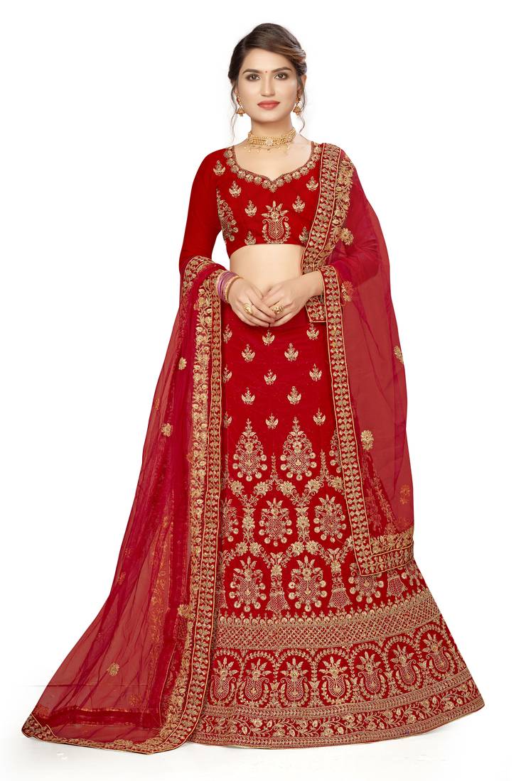 • Style : A Line Lehenga • Fabric : Velvet • Color : Red • Work : Embroidered Dupatta Details