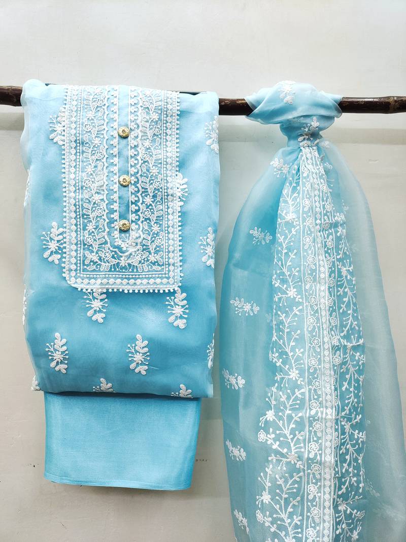 Women'S Sky Blue Unstitched Heavy Thread Embrodiery With Embroidered Dupatta Organza Dress Material Having Sky Blue Color Bottom Of Santoon Fabric And Sky Blue Color Dupatta Of Organza Material With Fancy Sky Blue Colour In Organja Santoon Fabric With Work Of Heavy Thread Embrodiery With Embroidered Dupatta|| Images Are For The Referance Purpose Only, Color Of The Actual Product May Little Vary From The Image Due To Screen Resolution