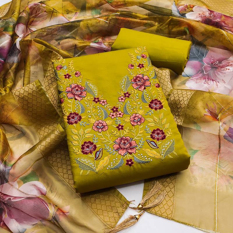 Women'S Green Unstitched Embroidered Neck And Fancy Border Roman Silk Dress Material Having Green Color Unstitched Bottom Of Roman Silk Fabric And Multi Color Dupatta Of Organja Jacquard Material With Charming Green Colour In Roman Silk Organja Jacquard Fabric With Work Of Heavy Embroidered Neck And Fancy Border With Designer Printed Dupatta|| Images Are For The Referance Purpose Only, Color Of The Actual Product May Little Vary From The Image Due To Screen Resolution