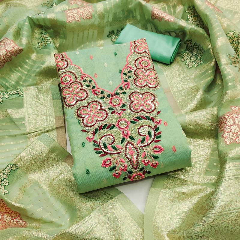 Women'S Light Green Unstitched Embroidered Neck And Fancy Border Simmer Butti Dress Material Having Light Green Color Unstitched Bottom Of Santoon Fabric And Light Green Color Dupatta Of Simmer Jacquard Material With Designer Light Green Colour In Simmer Butti Santoon Jacquard Fabric With Work Of Heavy Embroidered Neck And Fancy Border With Designer Woven Dupatta|| Images Are For The Referance Purpose Only, Color Of The Actual Product May Little Vary From The Image Due To Screen Resolution