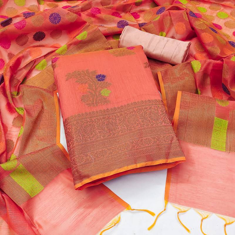 Women'S Peach Unstitched Designer Weaving With Fancy Dupatta Banarasi Jacquard Dress Material Having Peach Color Bottom Of Santoon Fabric And Peach Color Dupatta Of Banarasi Jacquard Material With Charming Peach Colour In Banarasi Jacquard Santoon Fabric With Work Of Designer Weaving With Fancy Dupatta|| Images Are For The Referance Purpose Only, Color Of The Actual Product May Little Vary From The Image Due To Screen Resolution