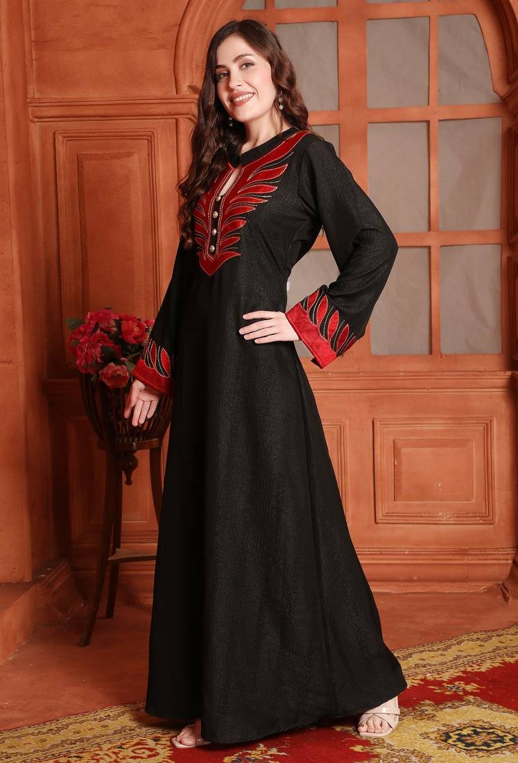 Designer Jalabiya In Black With Red Embroidery And Buttons