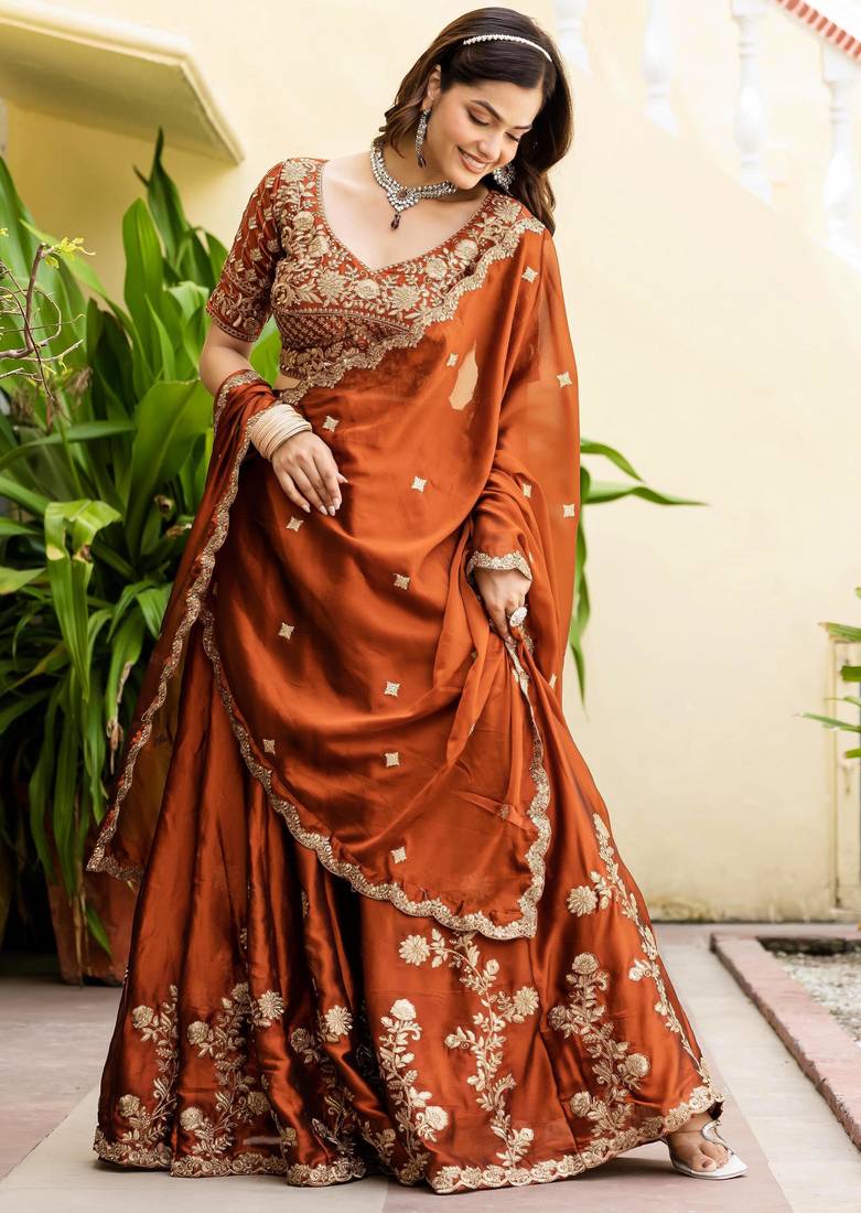 Appealing Rust Orange Zari And Sequins, And Thread Embroidered Rangoli Silk Indian Wedding Designer Lehenga Choli
