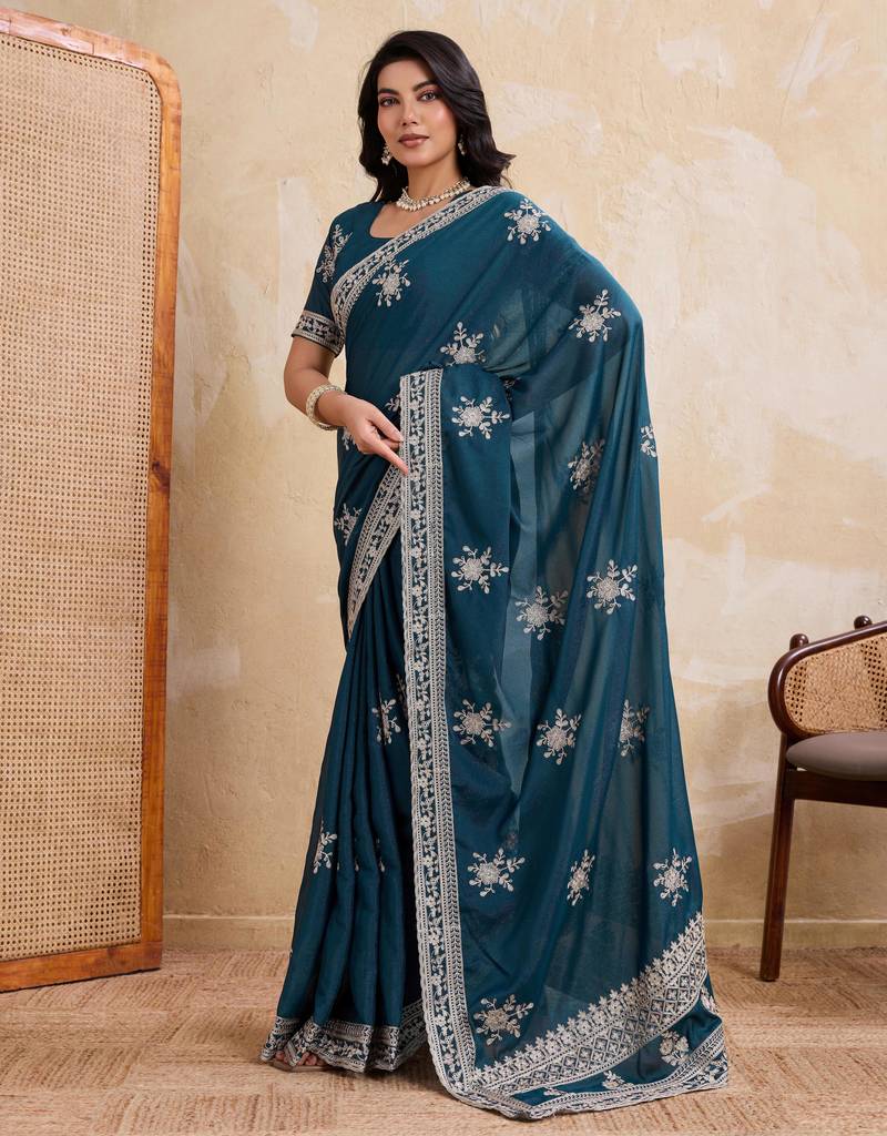 • Border : Embroidered Border • Fabric Of : Georgette • Color : Teal • Color : Teal Blouse Details