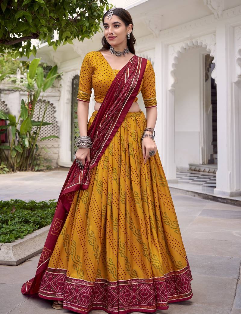 Glamorous Yellow Tasar Silk Bandhej Print With Gotta Patti Lace Touch Up Indian Wedding Lehenga Choli Dress