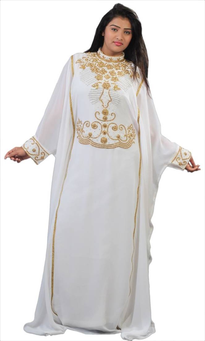 • Product Id : 2665134 • Package Details : 1 Kaftan • Type : Kaftans • Region : Muslim • Occasion : Party Wear • Fabric : Georgette • Type : Zari Work • Look : Contemporary • Color : Cream • Stitching : Stitched • Length : 60 • Width : Na • Height : Na Stitching [+]