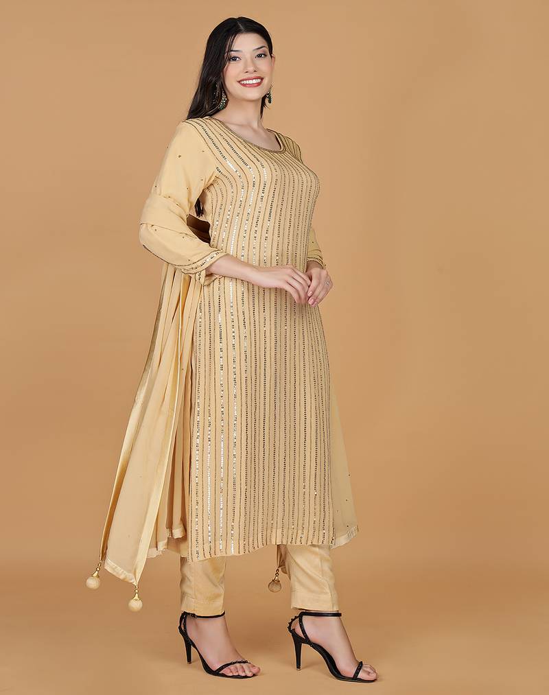 • Product Id : 4679366 • Package Details : 1 Kurta / 1 Pant / 1 Dupatta • Type : Kurta Sets • Sleeve : Quarter Sleeve • Fabric : Georgette • Color : Beige • Work : Cut Dana • Stitching : Stitched Payments [+]