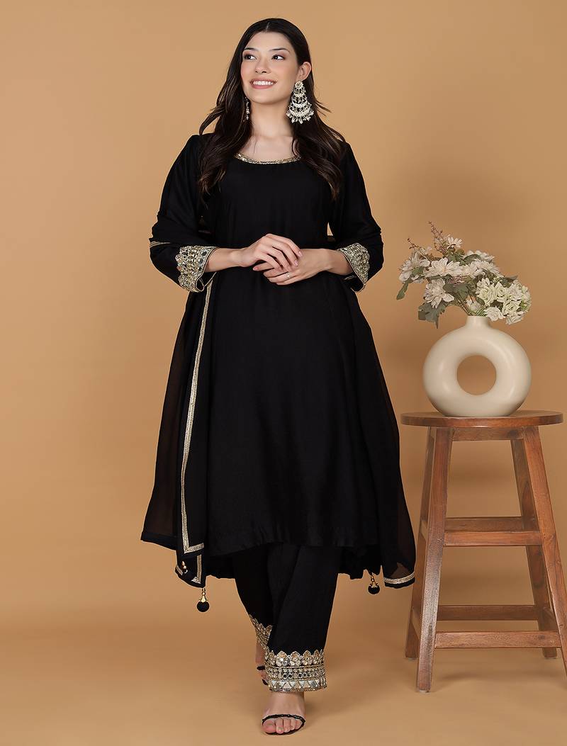 • Product Id : 4679359 • Package Details : 1 Kurta / 1 Palazzo / 1 Dupatta • Type : Kurta Sets • Sleeve : Full Sleeve • Color : Black • Fabric : Katan Silk • Work : Mirror • Stitching : Stitched Payments [+]