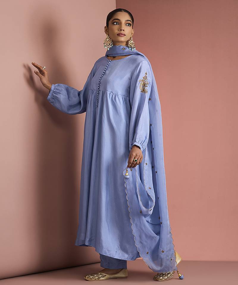 • Product Id : 4688722 • Package Details : 1 Kurta / 1 Pant / 1 Dupatta • Type : Kurta Sets • Work : Plain • Sleeve : Full Sleeve • Color : Blue • Fabric : Silk Blend • Stitching : Stitched Payments [+]