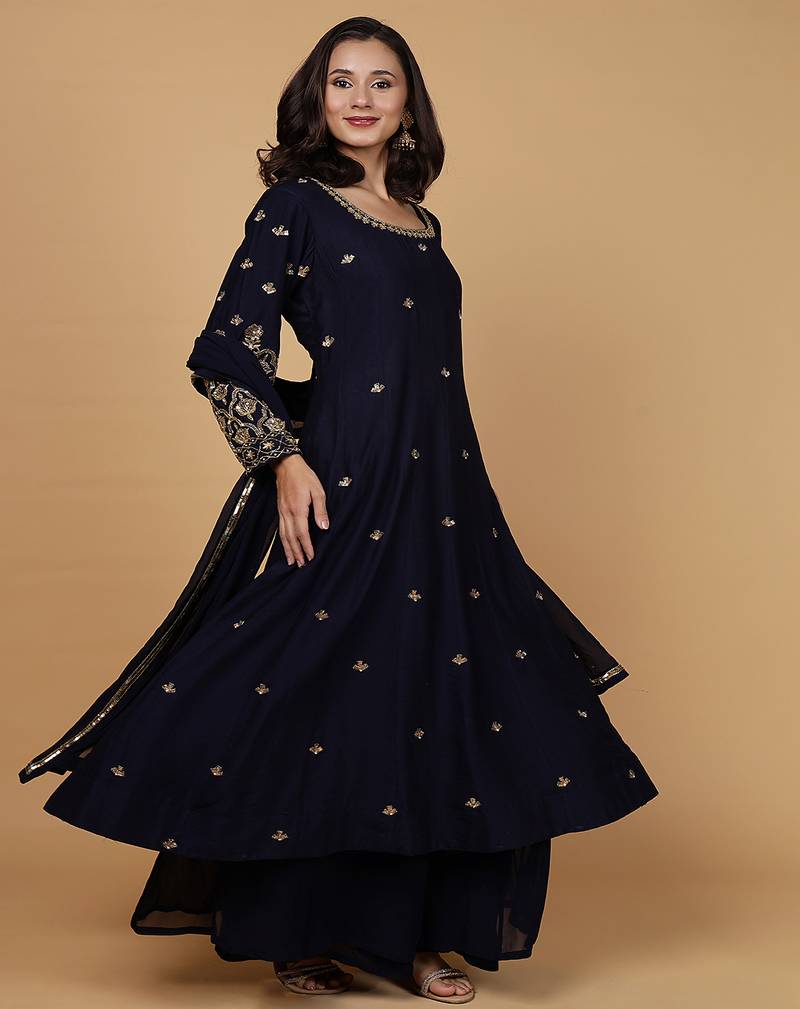 • Product Id : 4679339 • Package Details : 1 Anarkali / 1 Palazzo / 1 Dupatta • Type : Kurta Sets • Sleeve : Full Sleeve • Color : Dark Blue • Fabric : Katan Silk • Work : Cut Dana • Stitching : Stitched Payments [+]
