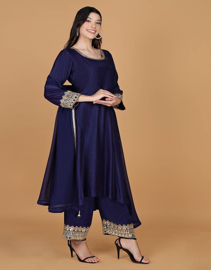 Dark Blue With Mirror Work Katan Silk Kurta And Pant With Georgette Duppatta Stitched