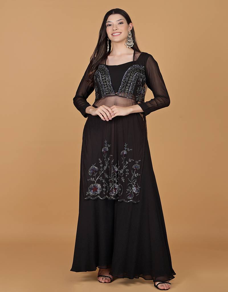 • Product Id : 4679360 • Package Details : 1 Sharara / 1 Blouse / 1 Dupatta • Type : Kurta Sets • Sleeve : Full Sleeve • Fabric : Georgette • Color : Dark Brown • Work : Beads • Stitching : Stitched Payments [+]