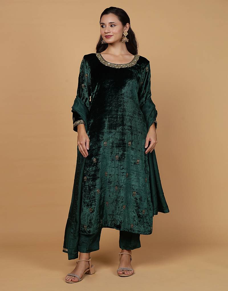 • Product Id : 4679338 • Package Details : 1 Kurta / 1 Pant / 1 Dupatta • Type : Kurta Sets • Sleeve : Full Sleeve • Fabric : Velvet • Color : Dark Green • Work : Beads • Stitching : Stitched Payments [+]