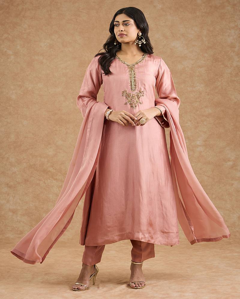 Dull Peach Opara Silk Hand Embroidered Kurta Set Stitched