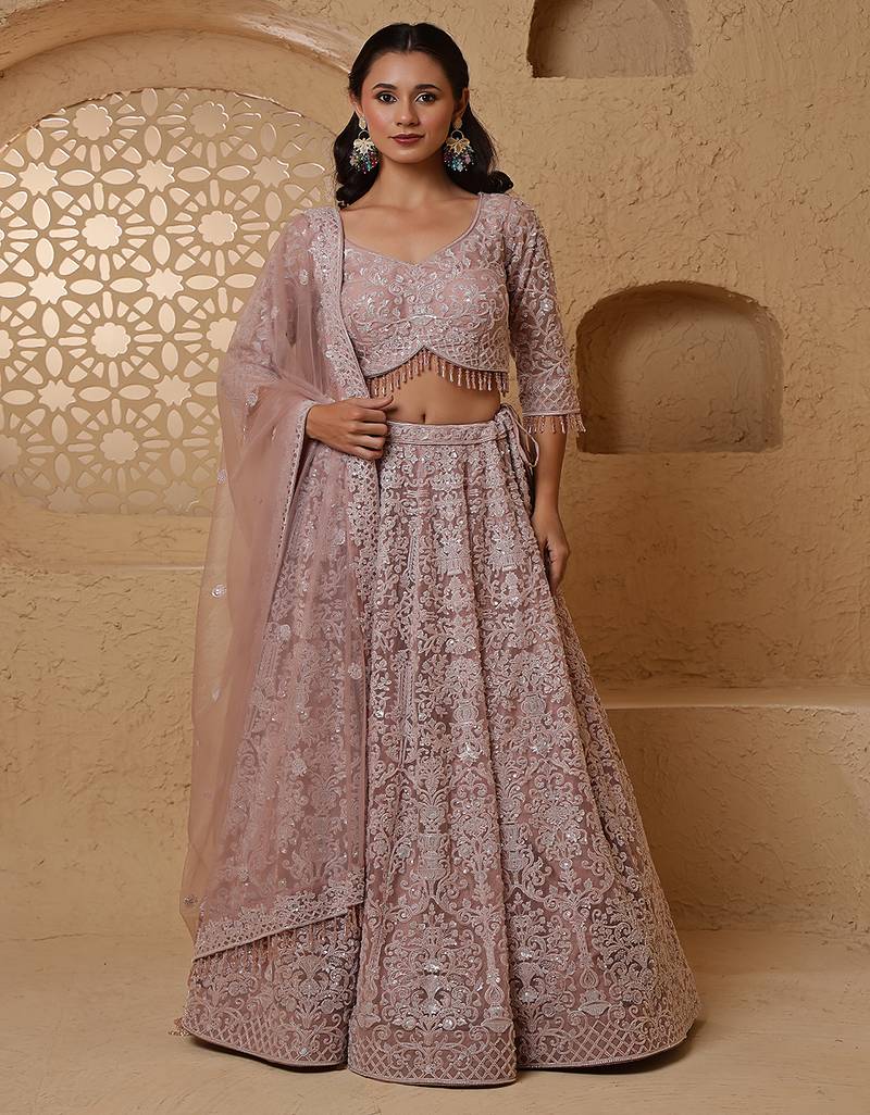 Dull Pink Net Lehenga Set With Monotone Embroidery