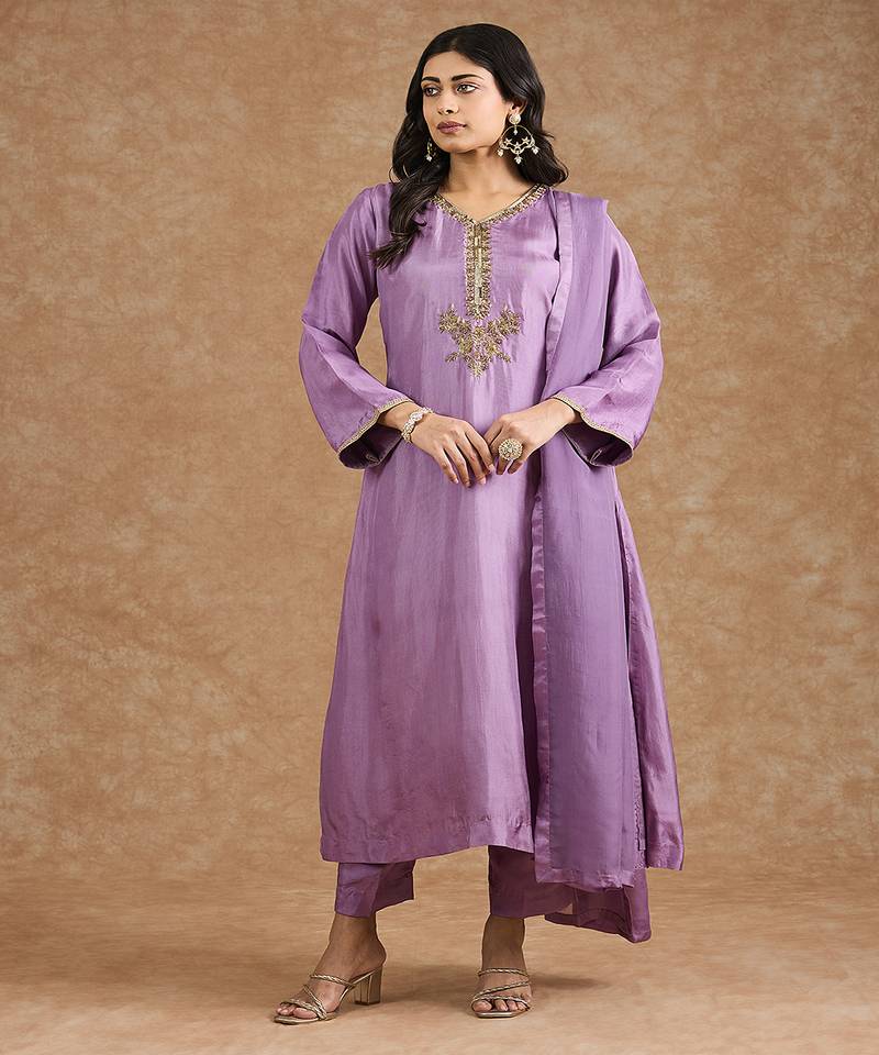 Dull Purple Opara Silk Hand Embroidered Kurta Set Stitched