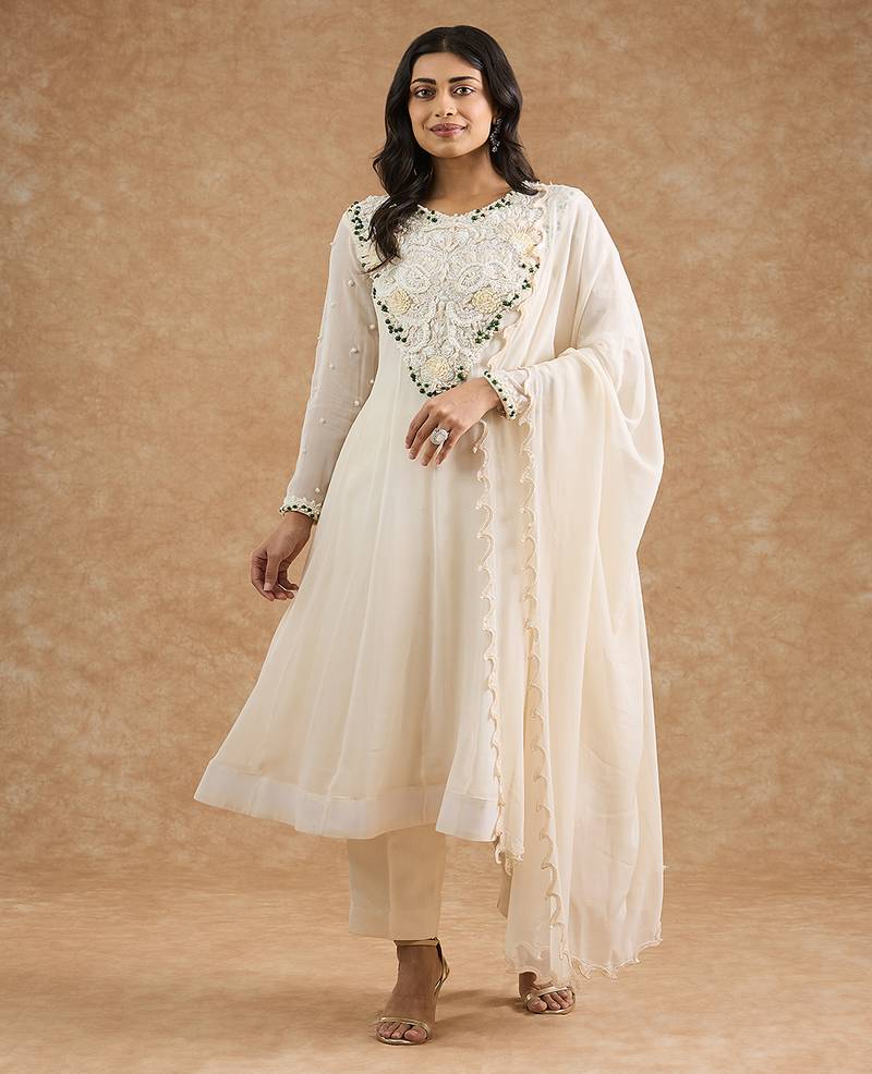 Ivory Georgette Applique Work Anarkali Set Stitched