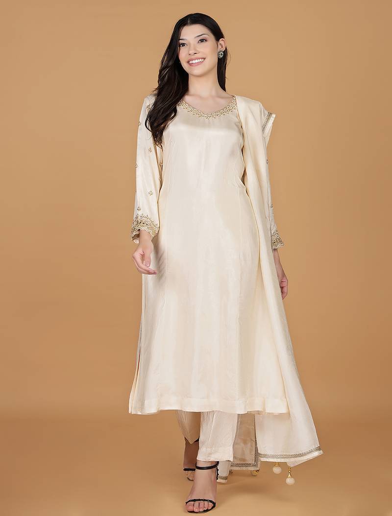 • Product Id : 4679361 • Package Details : 1 Kurta / 1 Pant / 1 Dupatta • Type : Kurta Sets • Sleeve : Full Sleeve • Color : Ivory • Fabric : Uppada Silk • Work : Cut Dana • Stitching : Stitched Payments [+]
