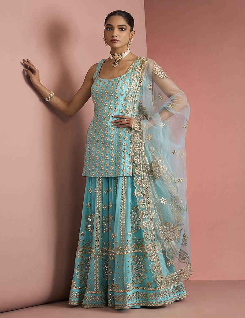 Light Blue Georgette Gotta Applique Sharara Set Stitched